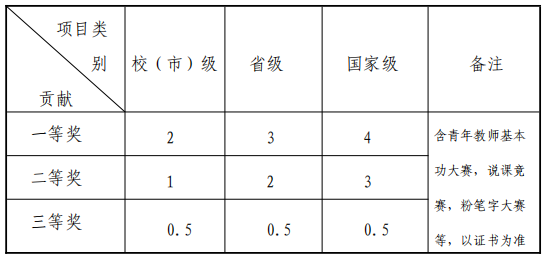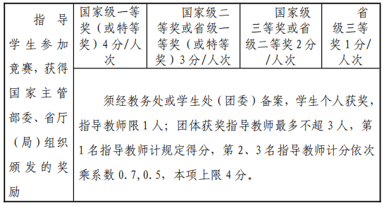⑦指導(dǎo)學(xué)生獲得市廳級(jí)及以上賽事一、二、三等獎(jiǎng)或金、銀、銅獎(jiǎng)的指導(dǎo)教師,學(xué)生獲得市廳級(jí)(不含校級(jí))獎(jiǎng)勵(lì)的第一指導(dǎo)教師,學(xué)生獲得省級(jí)獎(jiǎng)勵(lì)的前二名指導(dǎo)教師,學(xué)生獲得國(guó)家級(jí)獎(jiǎng)勵(lì)的前三名指導(dǎo)教師。